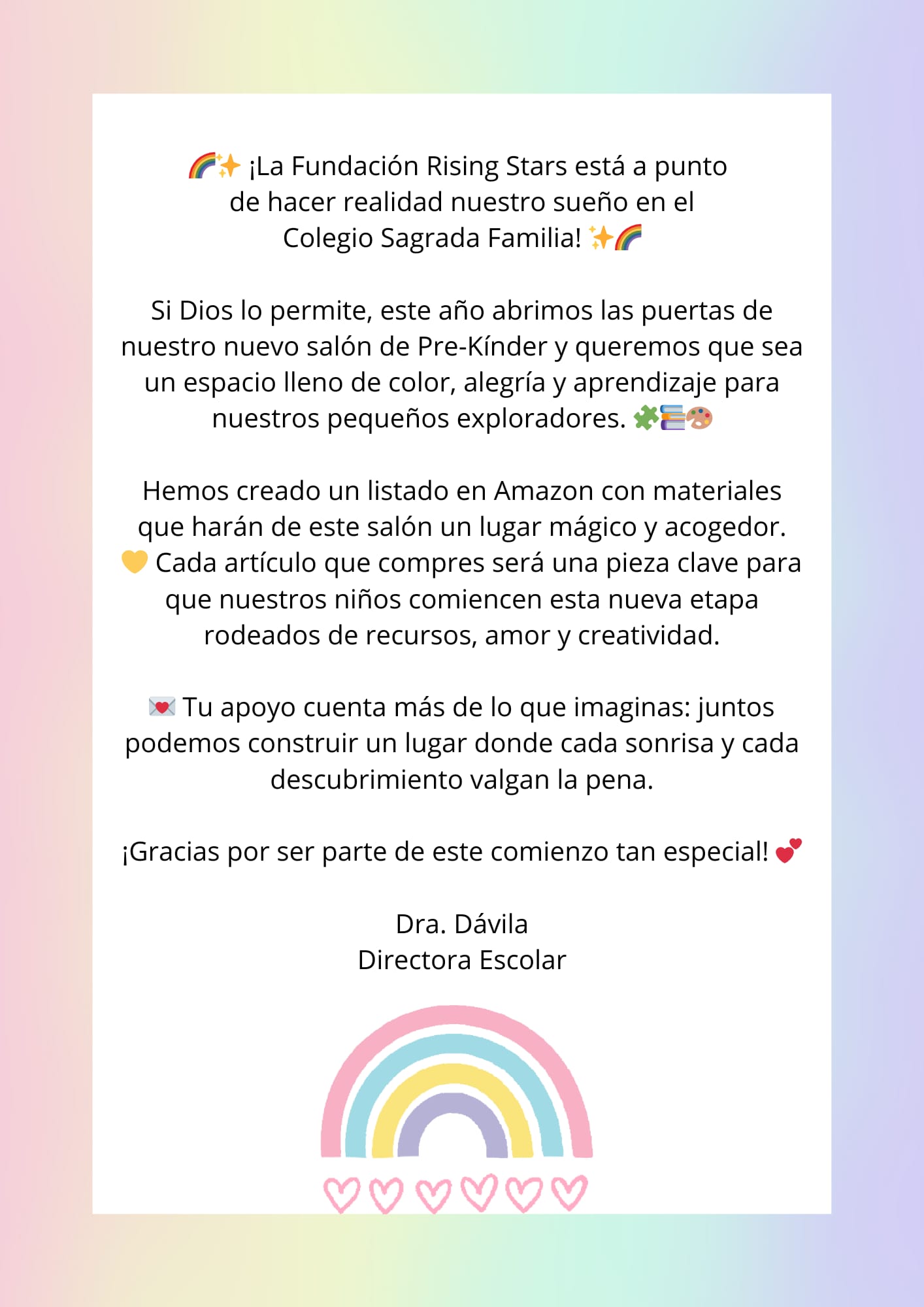 Hace más de una década, el Colegio Sagrada Familia ha contado con el valioso respaldo de la Fundación Rising Stars, quien, a través de alianzas con otras entidades mantiene en función el colegio. Una de estas entidades es la Fundación Ángel Ramos.